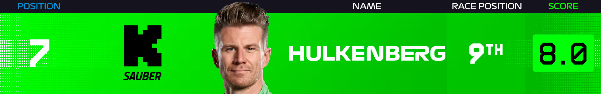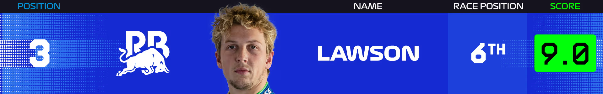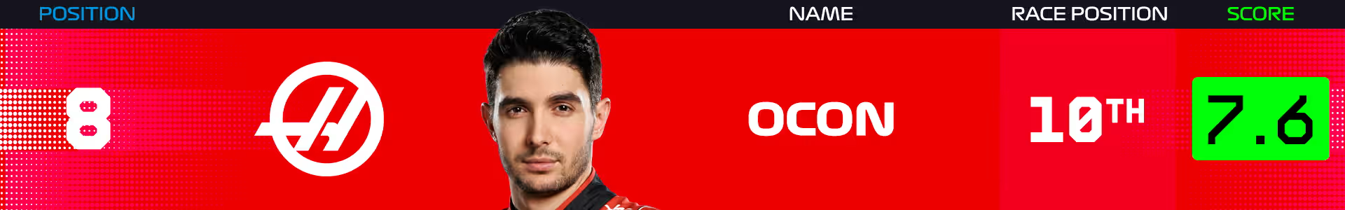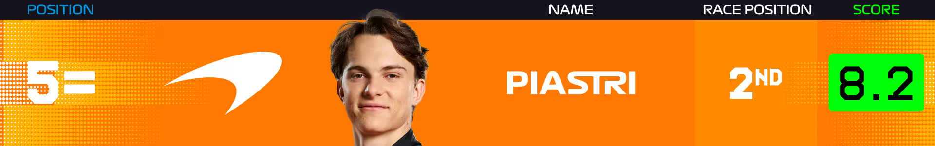 Q3 진출이 불발됐지만 롱런 페이스를 살려 P5 피니시. 단, 팀 전략(VSC 타이밍) 수혜를 받았다는 평가와 노리스-피아스트리-르클레르 트리오엔 전혀 위협이 되지 못한 점이 낮은 점수로 귀결
