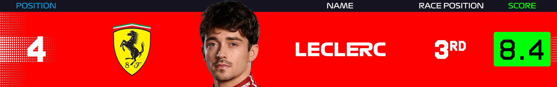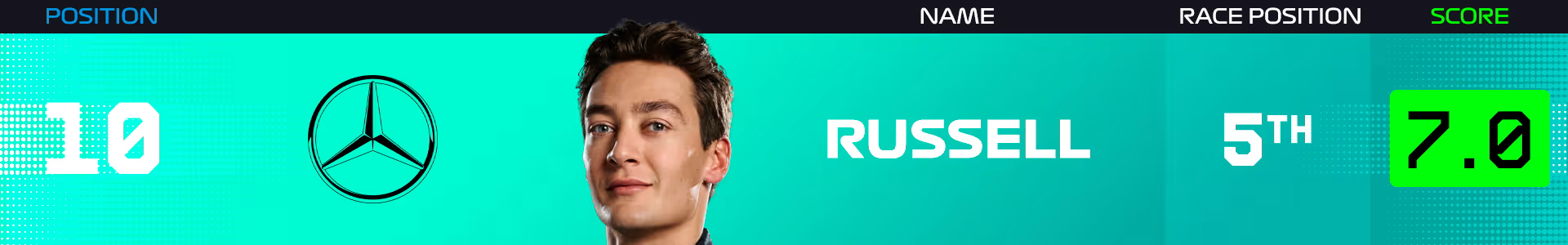 맥라렌 듀오 사이를 파고드는 예선 P2, 결승 P3로 '할 수 있는 최선'을 달성. 스타트 직후 피아스트리에게 추월당해 레이스 흐름을 끊긴 점이 감점 요인이나, 팀 메이트 루이스 해밀턴 대비 +13초 격하는 강한 어필.