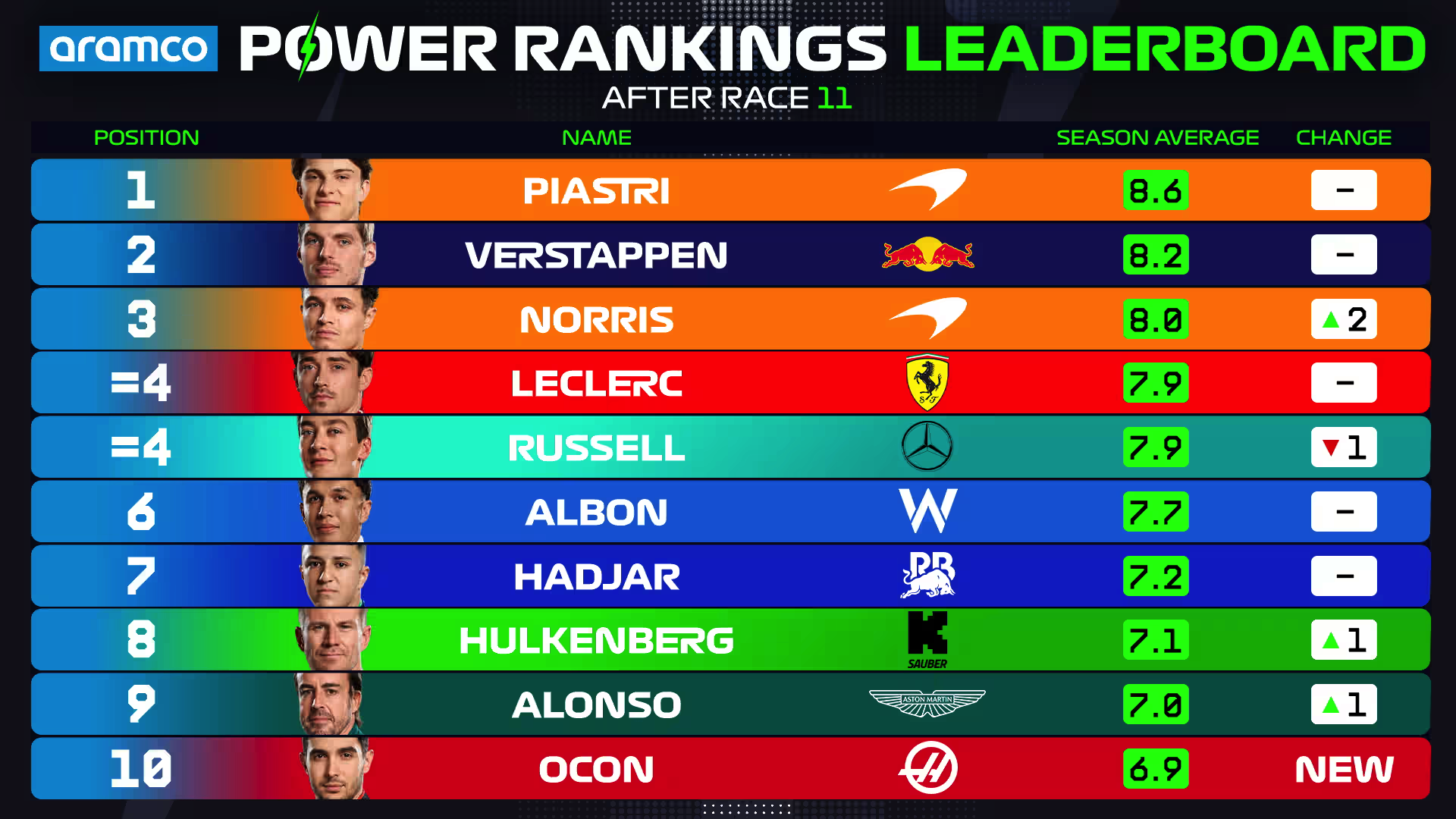 오콘은 Q1 탈락이라는 불리한 출발선에서도 하스 VF-25의 전략 잠재력을 극대화해 8위를 차지, 파워랭킹 판정단이 스타트 포지션 대비 순위 상승폭을 중시함을 다시금 증명했다.