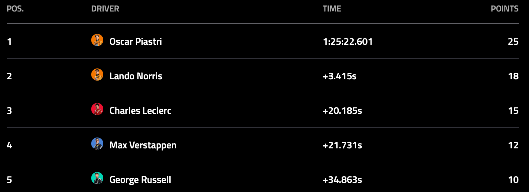 F1 2025 벨기에 그랑프리 레이스 결과: 1위 ~ 5위