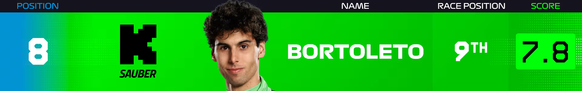 최근 6경기 중 3번째 포인트 피니시를 기록했다. 벨기에에서는 조용하게 레이스를 치렀지만, 스프린트에서는 10위, 본 레이스에서는 9번 그리드에 위치했다. 레이싱 불스 팀 동료 하자르보다 매번 뒤에 있었지만, 하자가 두 번째 피트로 인해 후미로 밀려난 사이 로슨은 차분하게 자신의 레이스를 이어가며 8위에 올랐다.