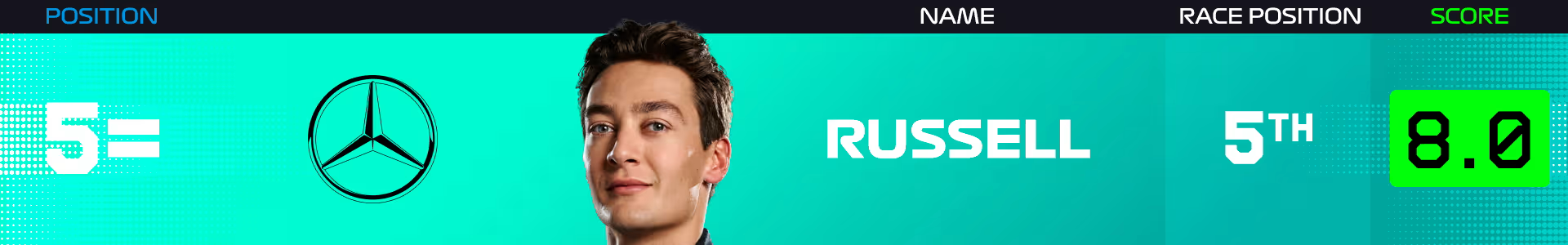 러셀은 2025 시즌 내내 일관성 있는 경기력을 보여주며 메르세데스를 훌륭하게 이끌고 있습니다. 예선 6위(해밀턴의 그리드 패널티로 5위)로 출발한 그는 선두권 싸움에 합류하기 위해 레이스 내내 최선을 다했습니다. 결국 두 페라리 드라이버 사이에 자리하며 5위를 기록, 팀에 안정적인 포인트를 안겨주었습니다.