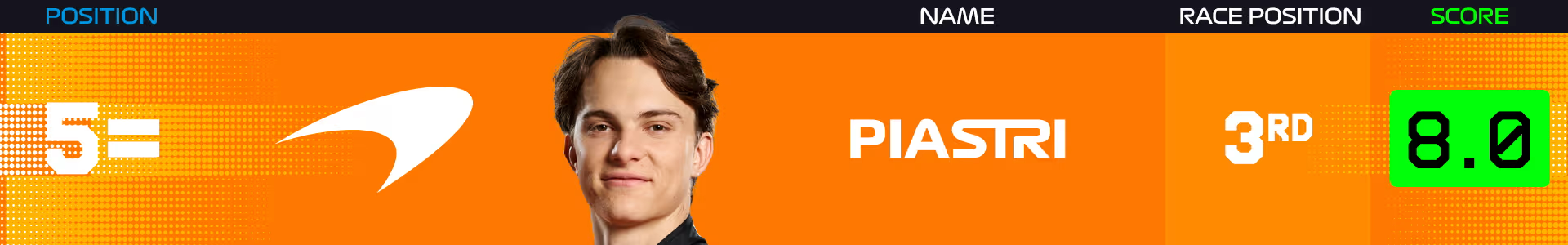 챔피언십 선두를 달리고 있는 피아스트리는 이번 주말 내내 노리스보다 한 발짝 뒤쳐지는 모습을 보였습니다. 예선과 결승 모두 3위에 만족해야 했죠. 특히 노리스의 피트 스톱이 늦어져 순위가 뒤바뀌었을 때, 그는 망설임 없이 순위를 양보하며 맥라렌의 '가치와 원칙'을 존중하는 모습을 보여주었습니다. 단순히 빠르기만 한 것이 아니라, 팀플레이도 뛰어난 선수임을 입증했습니다.