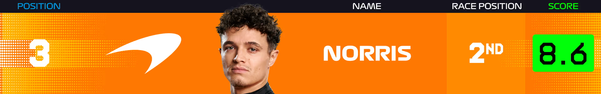 지난 네덜란드 그랑프리에서 불의의 사고로 리타이어하며 아쉬움을 삼켰던 노리스는 몬차에서 강력한 컴백을 알렸습니다. 세 번의 연습 주행 중 두 번이나 1위를 차지하며 훌륭한 페이스를 보여주었고, 팀 동료보다 앞서며 맥라렌의 선두를 이끌었습니다. 비록 느린 피트 스톱으로 인해 순위가 밀렸지만, 팀 오더 덕분에 포디움 기회를 놓치지 않으며 3위로 경기를 마쳤습니다.