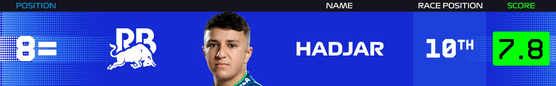 네덜란드에서 첫 포디움에 오르며 주목받았던 하자르는 몬차 예선에서 Q1 탈락이라는 아쉬운 결과를 맞이했습니다. 하지만 그는 포기하지 않았습니다. 새로운 파워 유닛 교체로 피트 레인에서 출발했음에도 불구하고, 뛰어난 추월 실력과 패기로 10위까지 치고 올라오며 마지막 포인트를 획득했습니다.
