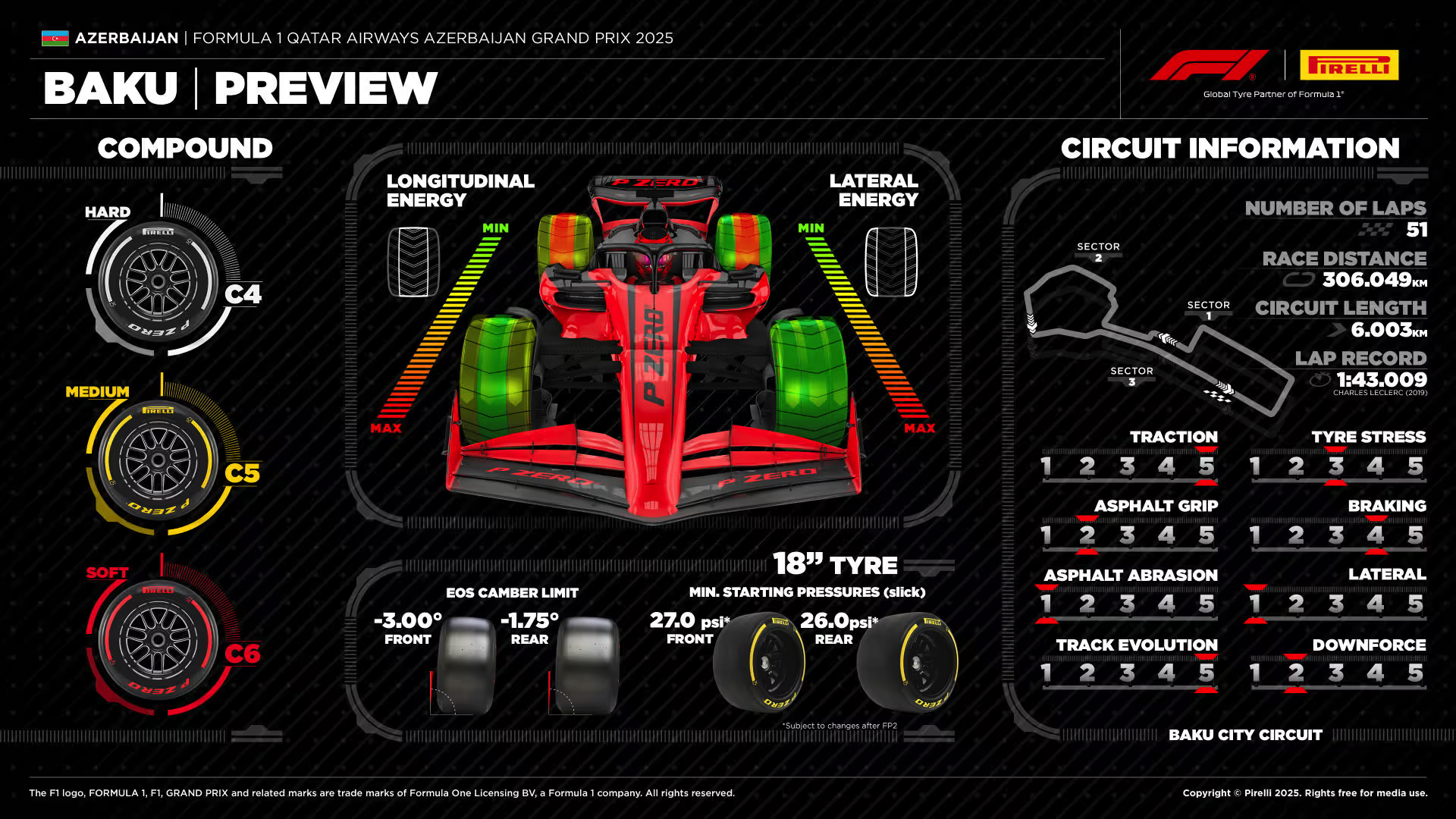 피렐리는 이번 그랑프리에 C4(하드), C5(미디엄), C6(소프트) 컴파운드를 공급하기로 결정했습니다. 이는 피렐리의 타이어 라인업 중 가장 부드러운 조합이며, 2024년보다 한 단계 더 부드러운 선택입니다. 이러한 결정의 배경에는 높은 확률의 원-스톱 레이스를 지양하고, 타이어 마모도를 높여 투-스톱 전략의 가능성을 열어둠으로써 더 많은 전략적 다양성을 창출하려는 명확한 의도가 있습니다. 몬트리올 이후 처음으로 C6 컴파운드가 돌아온 점도 주목할 만합니다.