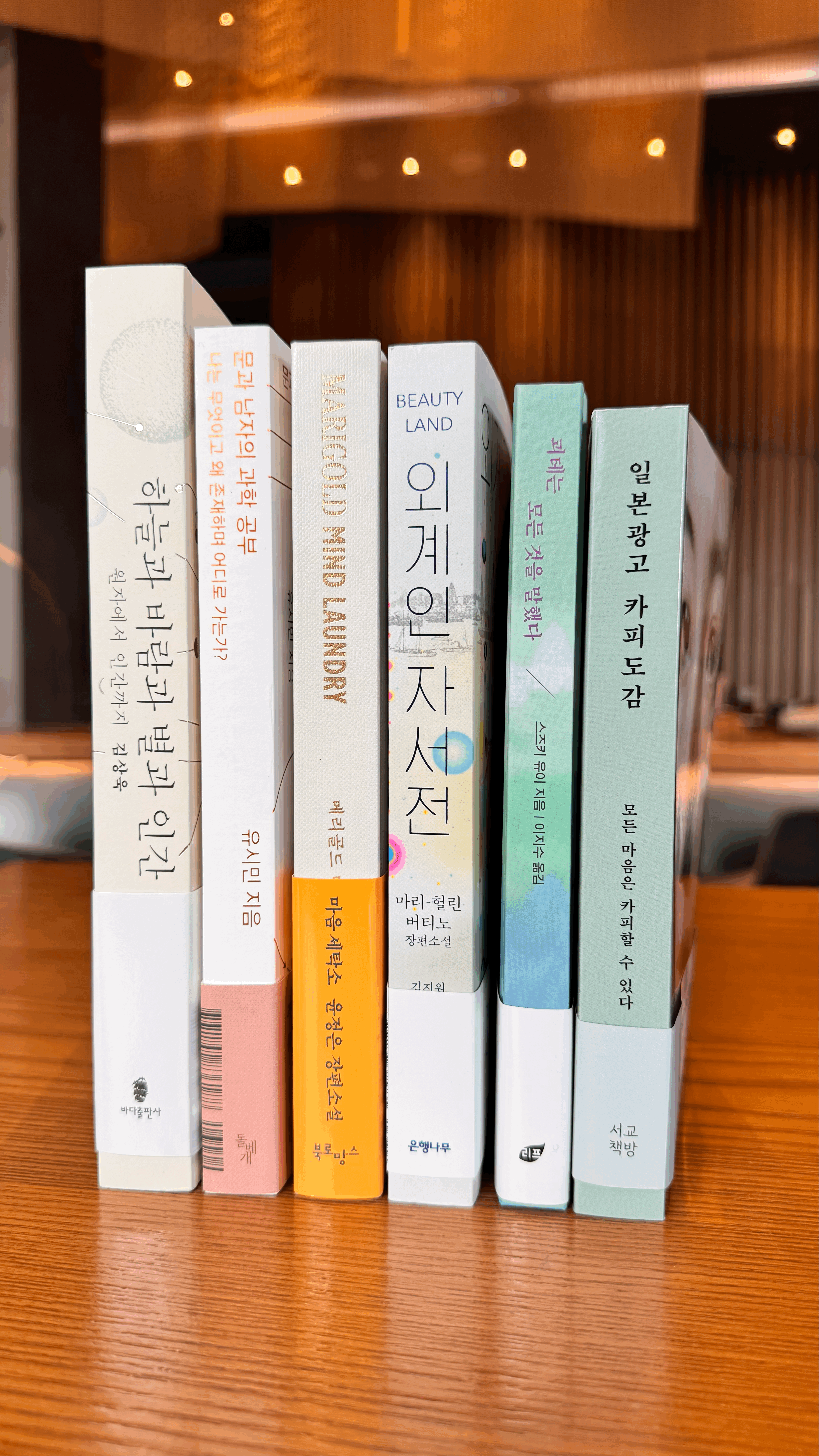 그렇게 서가를 누비며 고른 6권의 책. 평소라면 조금은 묵직한 인문학 서적이나 실용서를 집어 들었겠지만, 이번에는 지친 일상에 쉼표를 찍어줄 수 있도록 비교적 가볍게 읽을만한 책들로 골랐다.